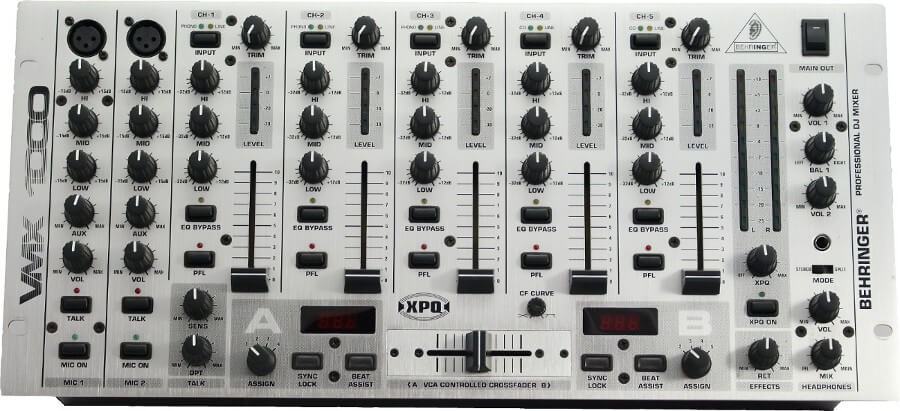 Der DJ-Mixer bietet fünf vollwertige Kanäle mit Klangregelung. An diese Kanäle kann jeder nur erdenkliche Zuspieler, wie zum Beispiel CD-Player, Plattenspieler, Laptops, Tablets, Smartphones, etc. angeschlossen werden. Außerdem stehen zwei weitere Kanäle, speziell für den Anschluss von Mikrofonen bereit. Beide Mikrofonkanäle sind mit einem Equalizer ausgestattet.