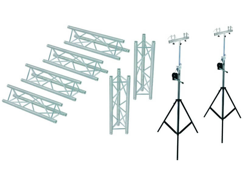 Außerdem sind passende Stative, sogenannte Traversenlifte, im Mietpreis enthalten. Die Traversenlifte werden mit Hilfe einer Kurbel ausgefahren und erreichen eine maximale Höhe von 4 Meter.